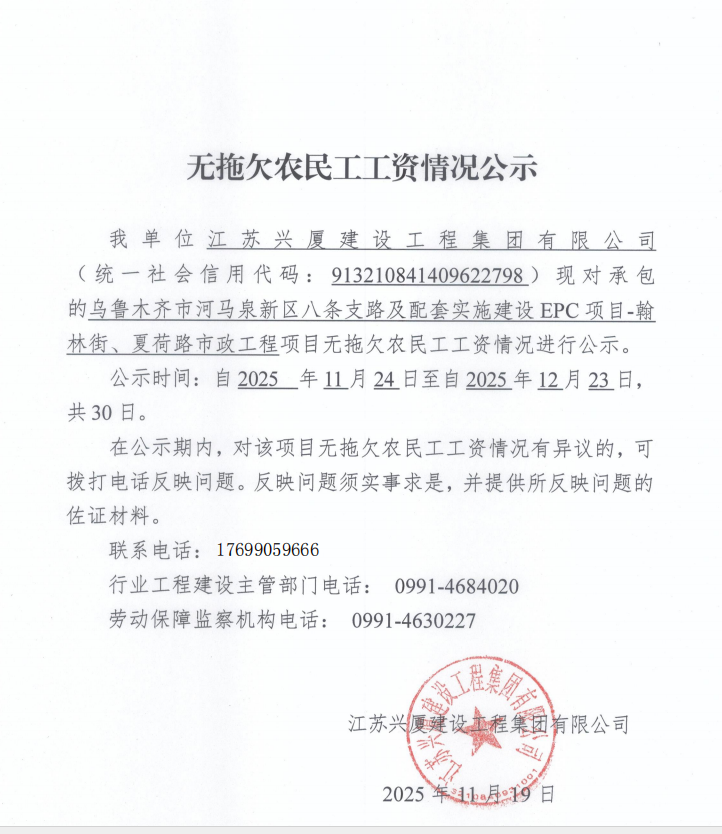 河马泉新区八条支路及配套实施建设EPC项目-翰林街、夏荷路市政工程项目无拖欠农民工工资情况公示