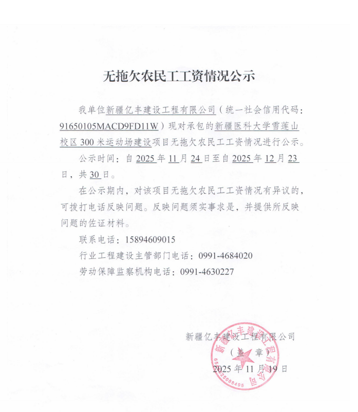 新疆医科大学雪莲山校区300米运动场建设项目无欠薪公示