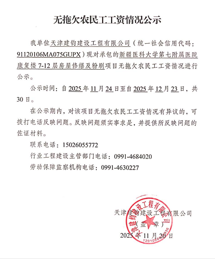 新疆医科大学第七附属医院康复楼7-12层房屋修缮及粉刷项目无欠薪公示