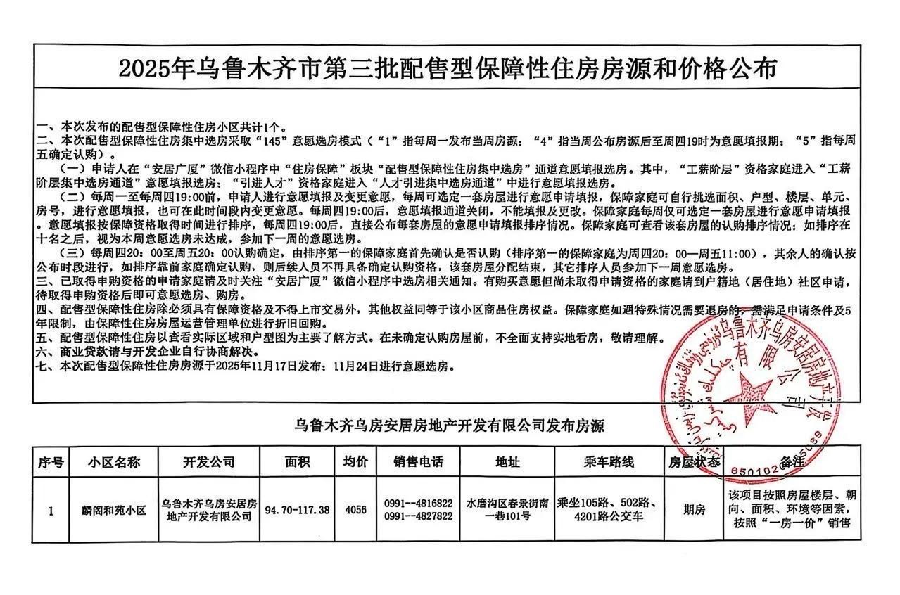 2025年乌鲁木齐市第三批配售型保障性住房房源和价格公布